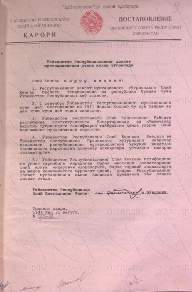 Ўзбекистон Республикаси "Ўзархив" агентлиги ахборот хизмати Мустақиллигимиз эълон қилинган тарихий ҳужжатнинг суратини ҳавола қилди.