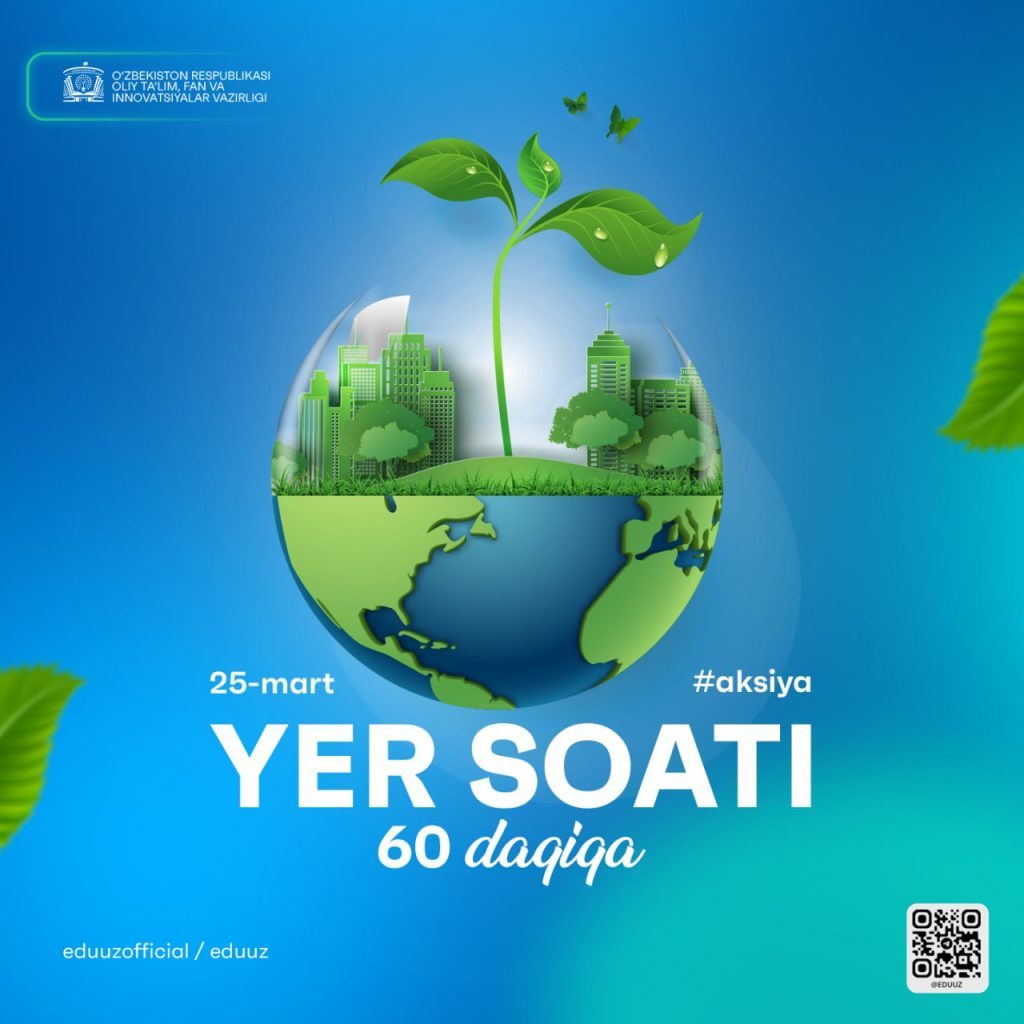 Aksiyasi doirasida shu kuni Yer sayyorasiga g‘amxo‘rlik qilish, tabiiy resurslarni asrash maqsadida bino va inshootlarda elektr jihozlarini bir soatga o‘chirish tavsiya etiladi.