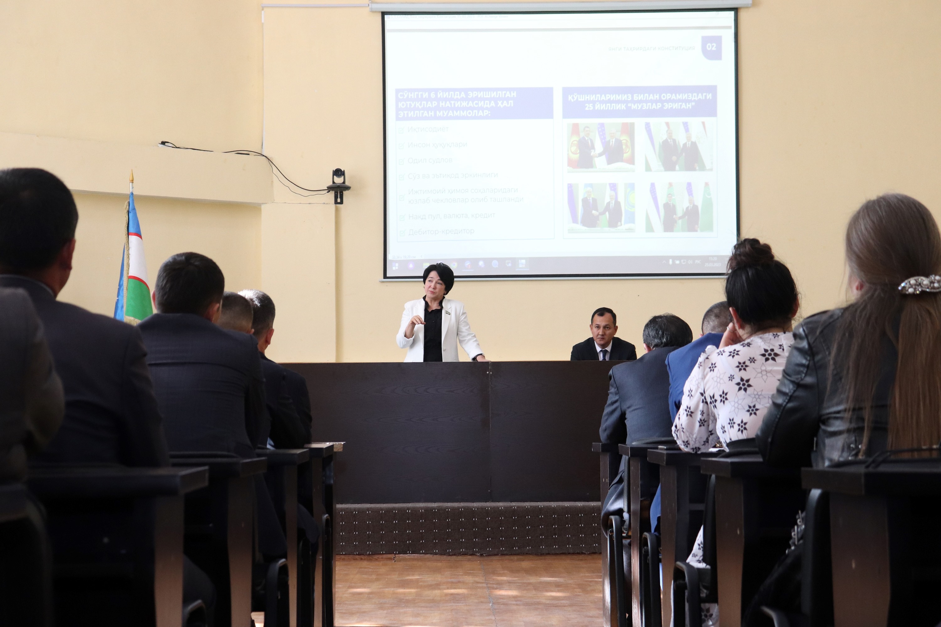 Ислом Каримов номидаги Тошкент давлат техника университети Олмалиқ филиалида “Конституциявий ислоҳотлар – бугунги кун талаби, эртанинг кафолати” мавзусида семинар-тренинг ўтказилди. Тадбирда Олий Мажлис Қонунчилик палатаси депутати Қизилгул Қосимова иштирок этди. Семинар-тренинг давомида Ўзбекистон Республикаси Конституциясининг янги таҳрирдаги лойиҳаси мазмун-моҳияти ҳақида кенг маълумотлар берилди.