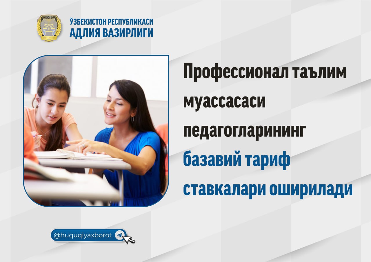 ☑️ Professional ta’lim muassasasi birinchi va ikkinchi malaka toifasiga ega bo‘lgan, malaka toifasiga ega bo‘lmagan oliy ma’lumotli hamda oliy ma’lumotga ega bo‘lmagan ishlab chiqarish ta’limi ustalarining bazaviy tarif stavkalari tegishincha umumiy o‘rta ta’lim muassasasi birinchi va ikkinchi malaka toifali o‘qituvchisi, oliy ma’lumotli o‘qituvchisi hamda o‘rta maxsus ma’lumotli o‘qituvchisining bazaviy tarif stavkalariga tenglashtiriladi.