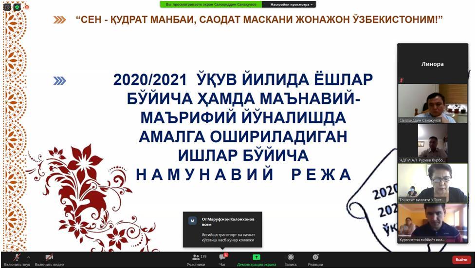 Ўзбекистон Республикаси Олий ва ўрта махсус таълим вазирлиги томонидан 2020 йил 20 август куни янги ташкил этилган профессионал таълими тизими раҳбарларига «Профессионал таълим муассасаларида ёшлар билан ишлаш ва маънавий-маърифий йўналишда амалга ошириладиган намунавий ишлар режаси тақдимоти» мавзусида масофавий ZOOM дастури орқали вебинар ўтказилди.