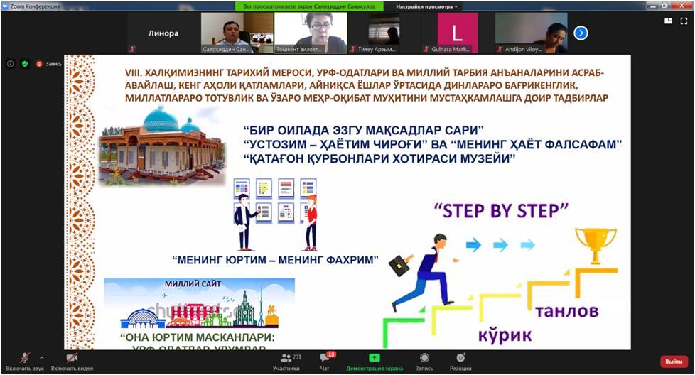 Вебинарда барча иштироқчилар қизгин қатнашиб маънавий-аҳлоқий тарбия ишлари самарадорлигини оширишга доир чора-тадбирларни муҳокама қилиб ўз таклифларини бердилар.