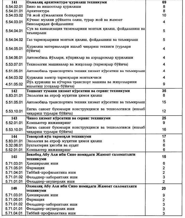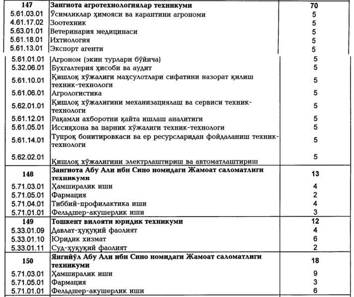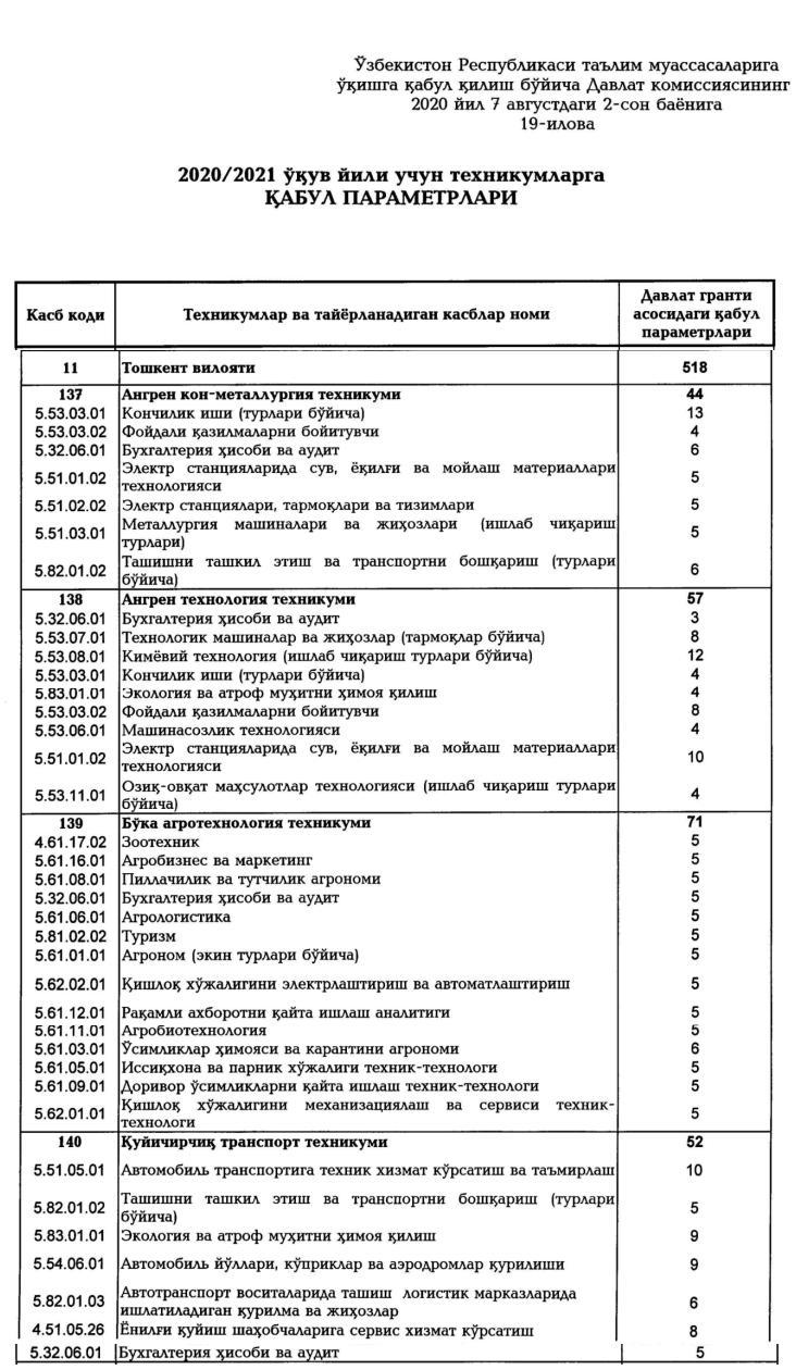 ТОШКЕНТ ВИЛОЯТИ ТЕХНИКУМЛАРГА АЖРАТИЛГАН ДАВЛАТ ГРАНТ ЎРИНЛАРИ 18.08.2020 Без рубрики 1,263 Просмотры