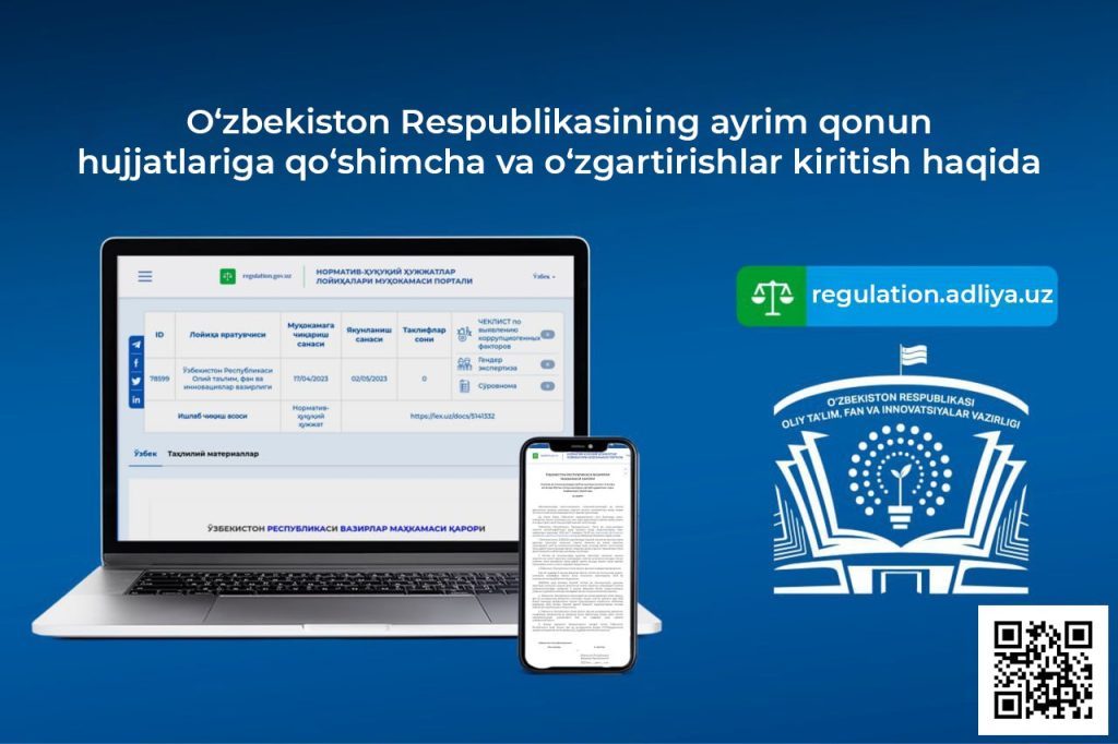 Mazkur topshiriq ijrosini ta’minlash maqsadida Oliy taʼlim, fan va innovatsiyalar vazirligi tomonidan Oʻzbekiston Respublikasining “Oʻzbekiston Respublikasining ayrim qonun hujjatlariga oʻzgartirish va qoʻshimchalar kiritish haqida”gi Qonuni loyihasi ishlab chiqildi.