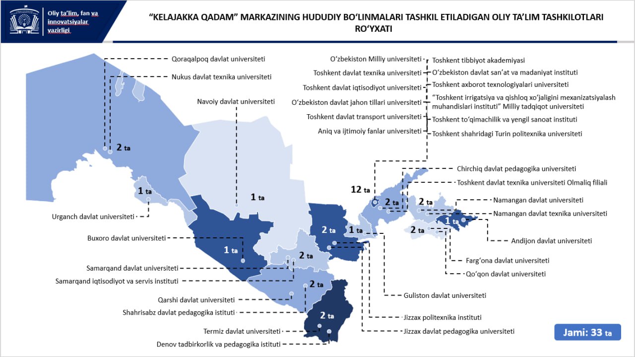 Oliy ta’lim, fan va innovatsiyalar vazirligi hamda “O‘zmilliybank” AJ hamkorligida oliy ta’lim muassasalari bitiruvchilarining bandligini ta’minlashga ko‘maklashuvchi “Kelajakka qadam” markazlarining hududiy bo‘linmalari tashkil etildi. Mazkur markazlar bugungacha jami 33 ta oliy ta’lim muassasasida ochildi.