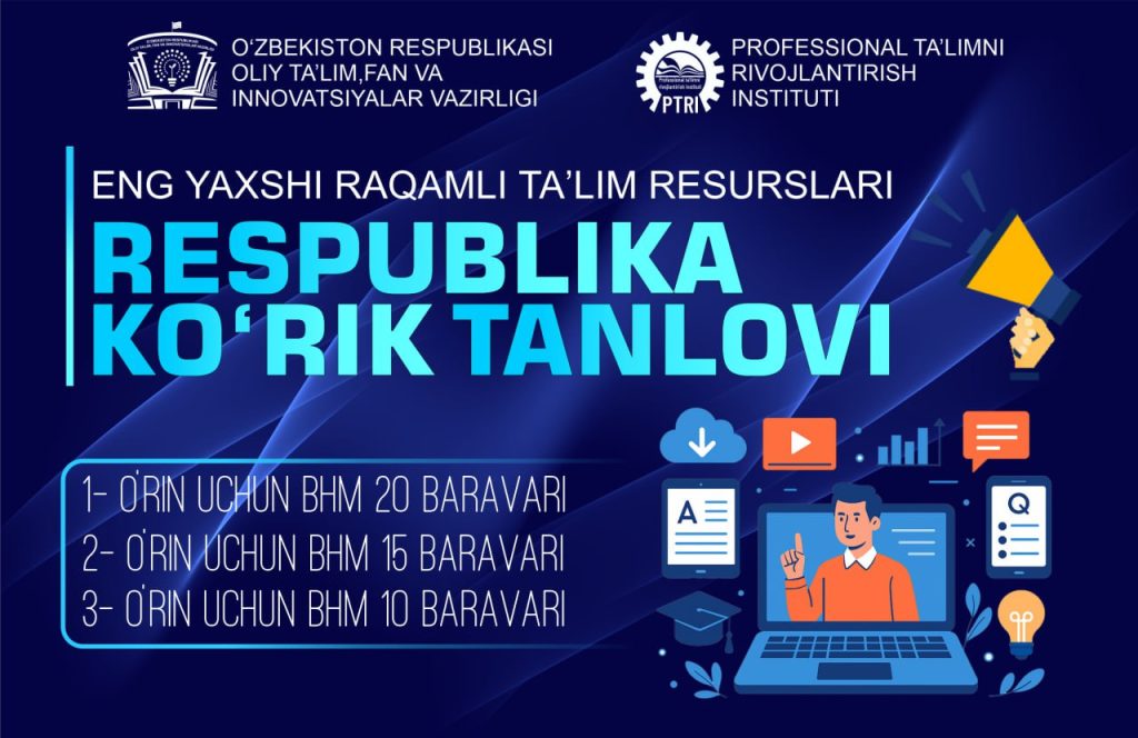 Kasbiy ta’lim tashkilotlari o‘qituvchi va ishlab chiqarish ta’limi ustalari o‘rtasida “Eng yaxshi raqamli ta’lim resurslari” Respublika ko‘rik-tanlovi boshlanganini e’lon qilamiz