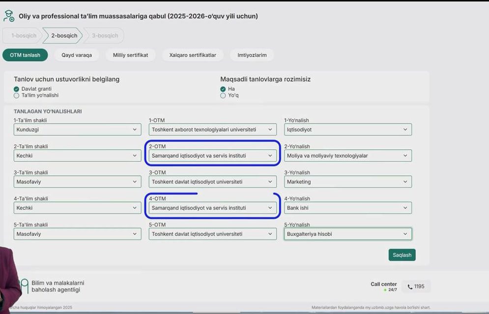 Shundan so‘ng abituriyent test topshirgan fanlar majmuasi va ta’lim tiliga mos bo‘lgan beshtagacha oliy ta’lim muassasasi va ta’lim yo‘nalishini ta’lim shakli bilan birga tanlaydi.
