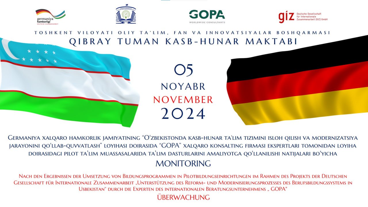 2024-yil 5-noyabr kuni Qibray tuman kasb-hunar maktabida Germaniya xalqaro hamkorlik jamiyatining “Oʻzbekistonda kasb-hunar taʼlim tizimini isloh qilish va modernizatsiya jarayonini qoʻllab-quvvatlash” loyihasi doirasida “GOPA” xalqaro konsalting firmasi ekspertlari tomonidan loyiha doirasidagi pilot taʼlim muassasalarida taʼlim dasturlarini amaliyotga qoʻllanilishi natijalari boʻyicha monitoring o`tkazildi.