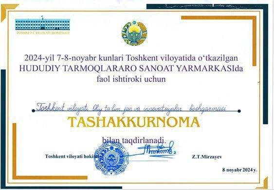 Joriy yilning 7-8-noyabr kunlari Toshkent viloyati Yangiyo‘l tumani “Tinchlik” sanoat zonasidagi “Tamerlan marketing” MCHJ korxonasi binosida tog‘-kon metallurgiyasi, kimyo sanoati, elektroenergetika, elektrotexnika, qurilish materiallari va qishloq xo‘jaligi texnikasini ishlab chiqarish sohalariga ixtisoslashgan hududiy tarmoqlararo sanoat yarmarkasi o‘tkazildi.