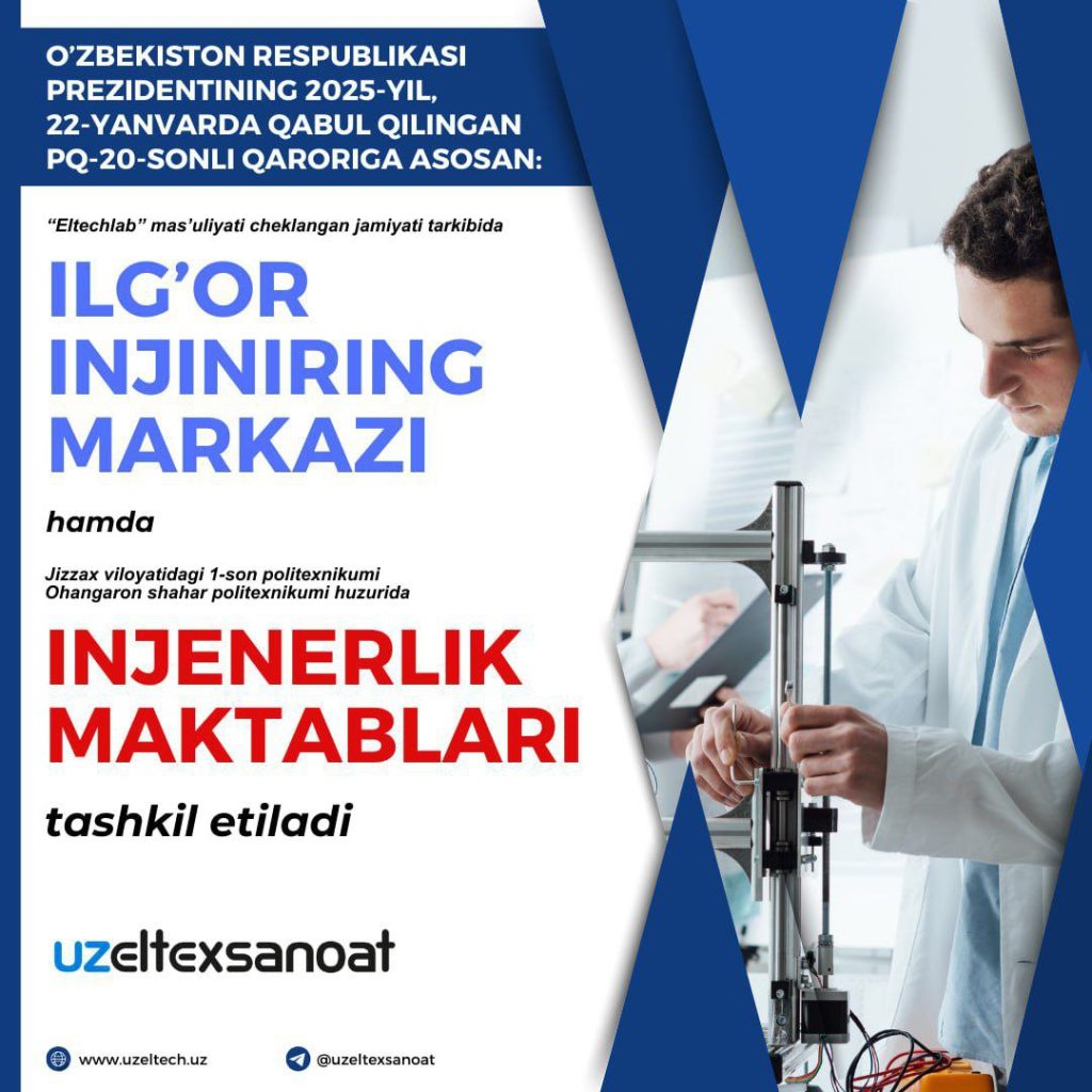 Ilg’or texnologiyalar asosida yangi mahsulot turlarini ishlab chiqish hamda soha uchun muhandis va o’rta bo’g’in kadrlarini tayyorlash maqsadida “Eltechlab” MCHJ tarkibida «Ilg’or injiniring markazi» tashkil etiladi.