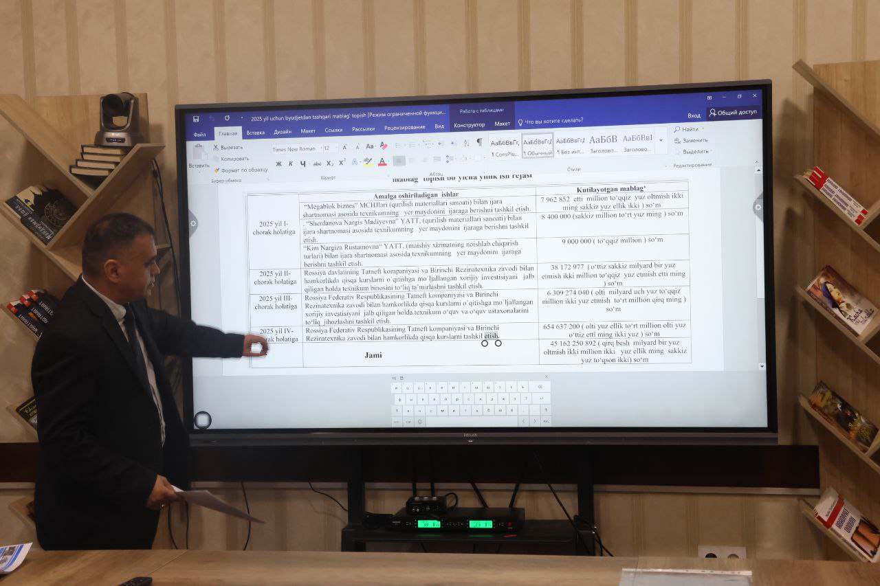 Taqdimotda tashkilotlar balansidagi bino va inshootlardan foydalanish, yer maydonlarini nazorat qilish, obodonlashtirish hamda byudjetdan tashqari mablag‘larni jalb etish masalalari muhokama qilindi. “Yashil makon” umummilliy loyihasi doirasida amalga oshirilayotgan ishlari bo‘yicha axborotlari tinglanadi.