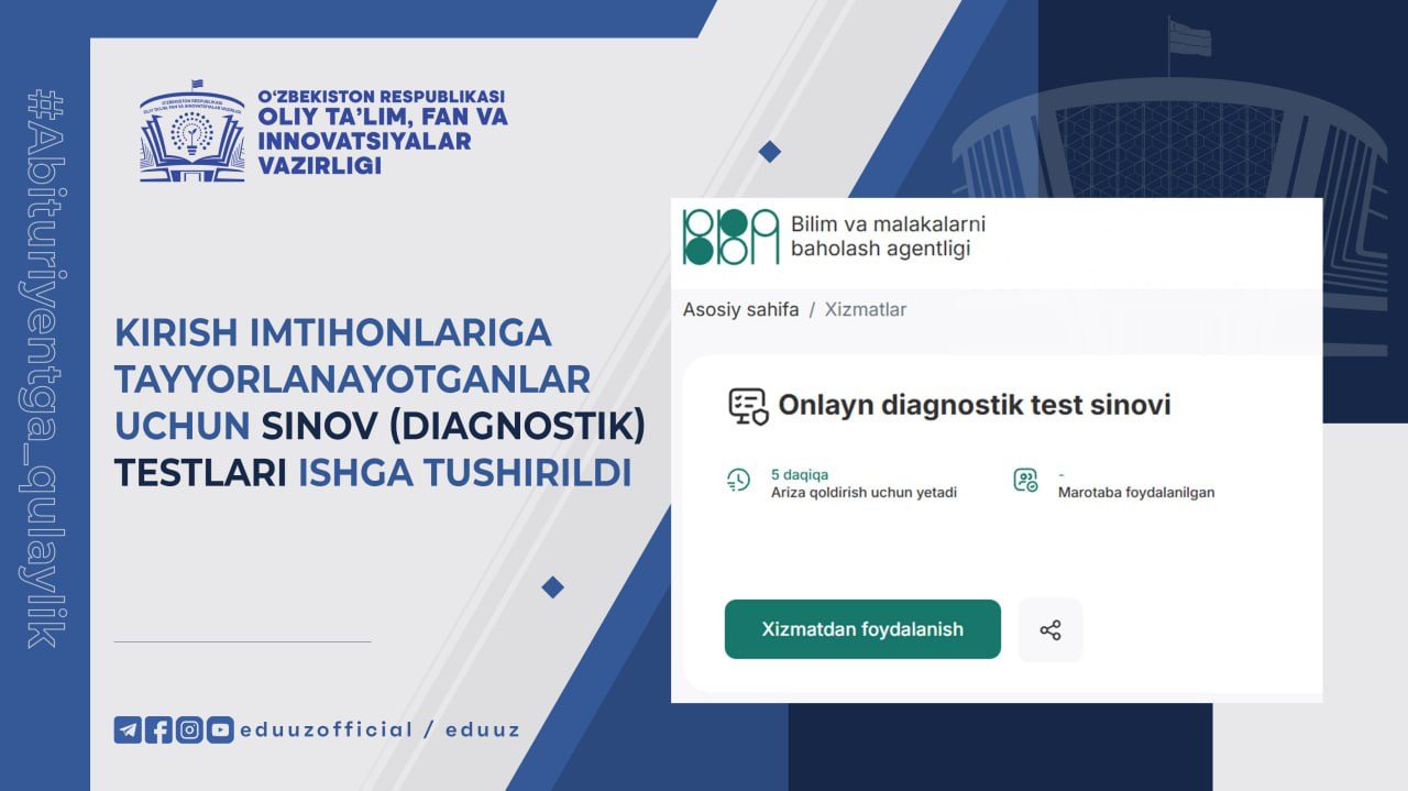 Endilikda kirish imtihonlarida qo‘llanilishi rejalashtirilgan test savollari asosida onlayn diagnostik testlar ishga tushirildi. (https://t.me/BaholashUz/7846)