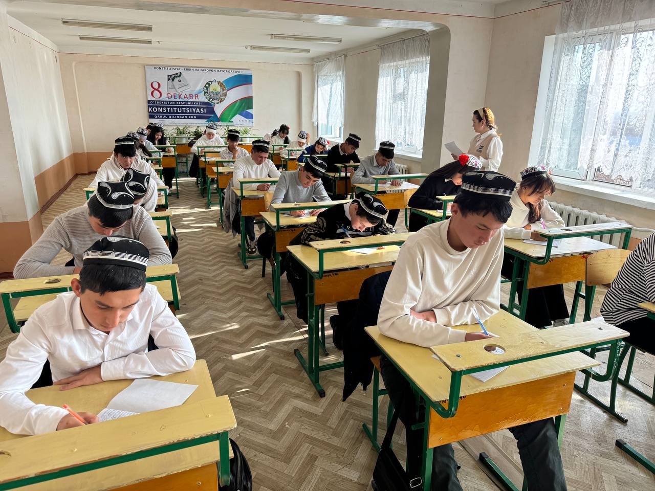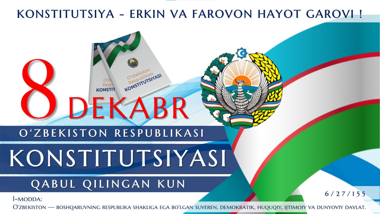 Qibray tuman kasb-hunar maktabida “Mening Konstitutsiyam 32 yoshda!” shiori ostida “Mening Konstitutsiyam va davlat tilim” mavzusida insholar tanlovi o‘tkazildi. Tadbir Ona tili va adabiyot fani o‘qituvchilari S. Abduqodirova va Z. Xakimovalar tomonidan tashkil etildi.