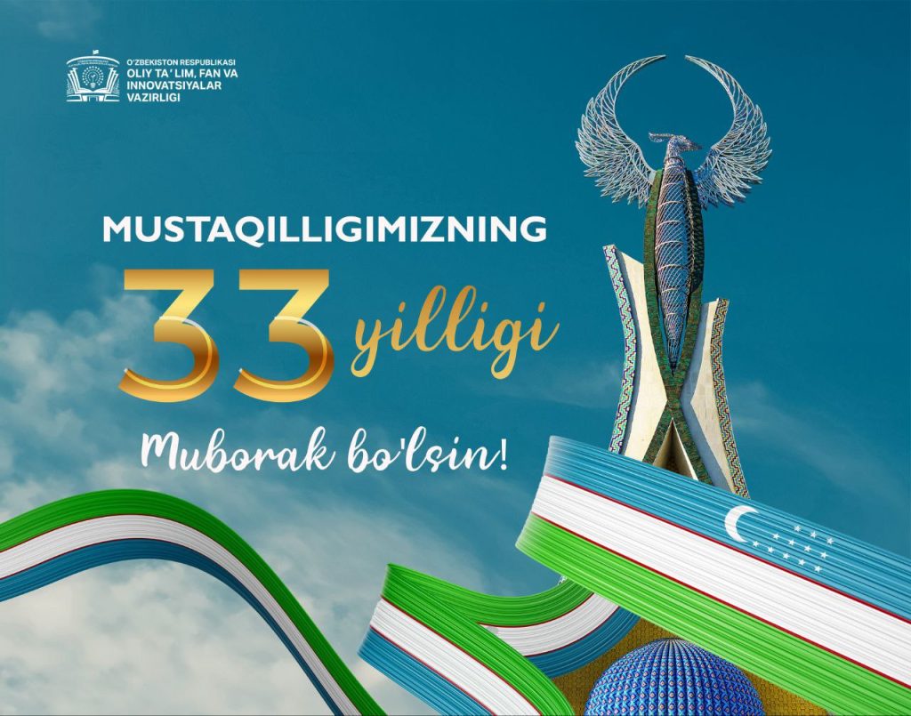 Oliy va professional talim tizimi barcha hodimlarini, butun xalqimizni eng aziz bayramimiz davlatimiz Mustakilligining 33 yillik bayrami bilan samimiy muborakbod etamiz!