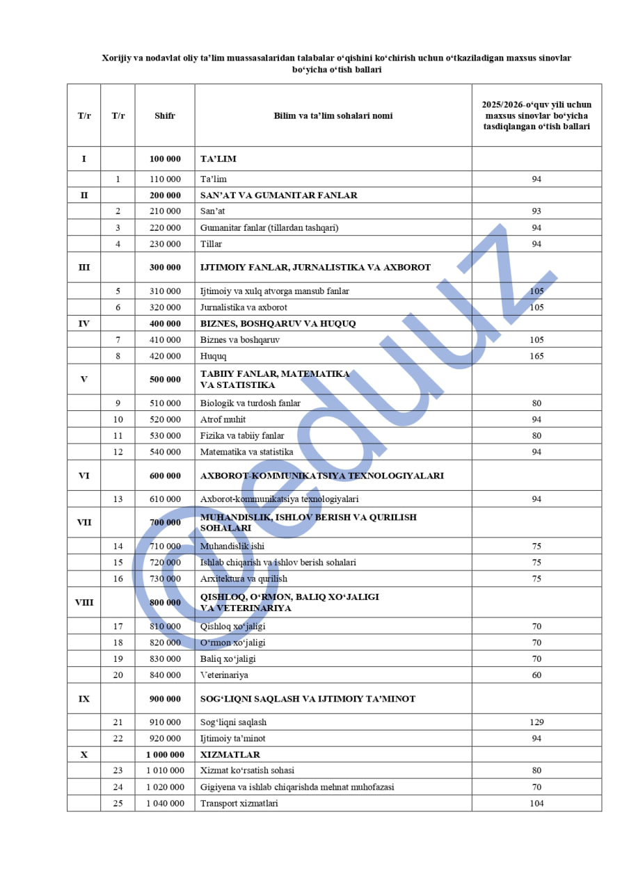 Oliy ta’lim, fan va innovatsiyalar vazirining tegishli buyrug‘i bilan 2025/2026-oʻquv yili uchun xorijiy va nodavlat oliy taʼlim muassasalaridan talabalar oʻqishini respublika davlat oliy taʼlim muassasalariga koʻchirish boʻyicha oʻtkaziladigan maxsus sinovlar boʻyicha oʻtish ballari tasdiqlandi.