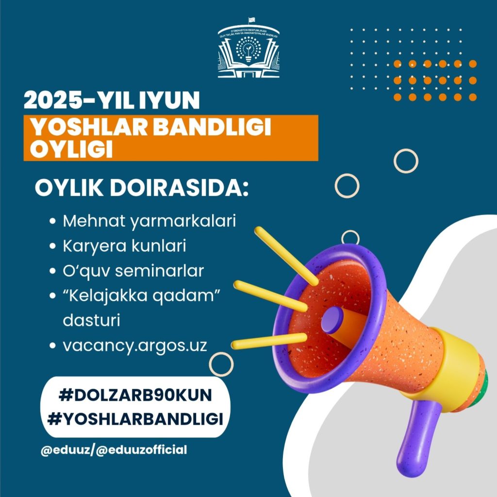 Barcha talabalar, bitiruvchilar va ish izlovchilarni yoshlar bandligi oyligida faol ishtirok etishga taklif qilamiz!