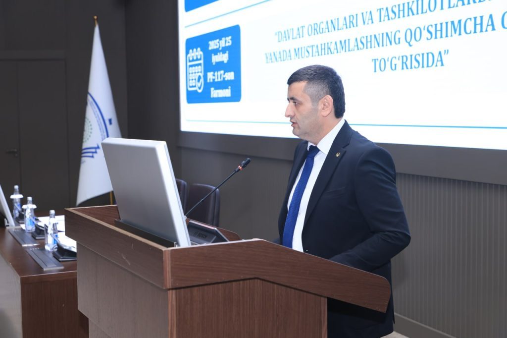 U o‘z nutqida ijro intizomini mustahkamlashning dolzarbligi, oliy ta’lim tizimidagi mas’uliyatli yondashuv zarurati hamda farmonning amaliy ahamiyatiga alohida urgʻu berdi. Seminar davomida ishtirokchilarga Prezident farmonining huquqiy asosi, davlat boshqaruvidagi ahamiyati hamda ijro intizomini mustahkamlash bo‘yicha qonunchilikdagi yangiliklar atroflicha tushuntirildi.