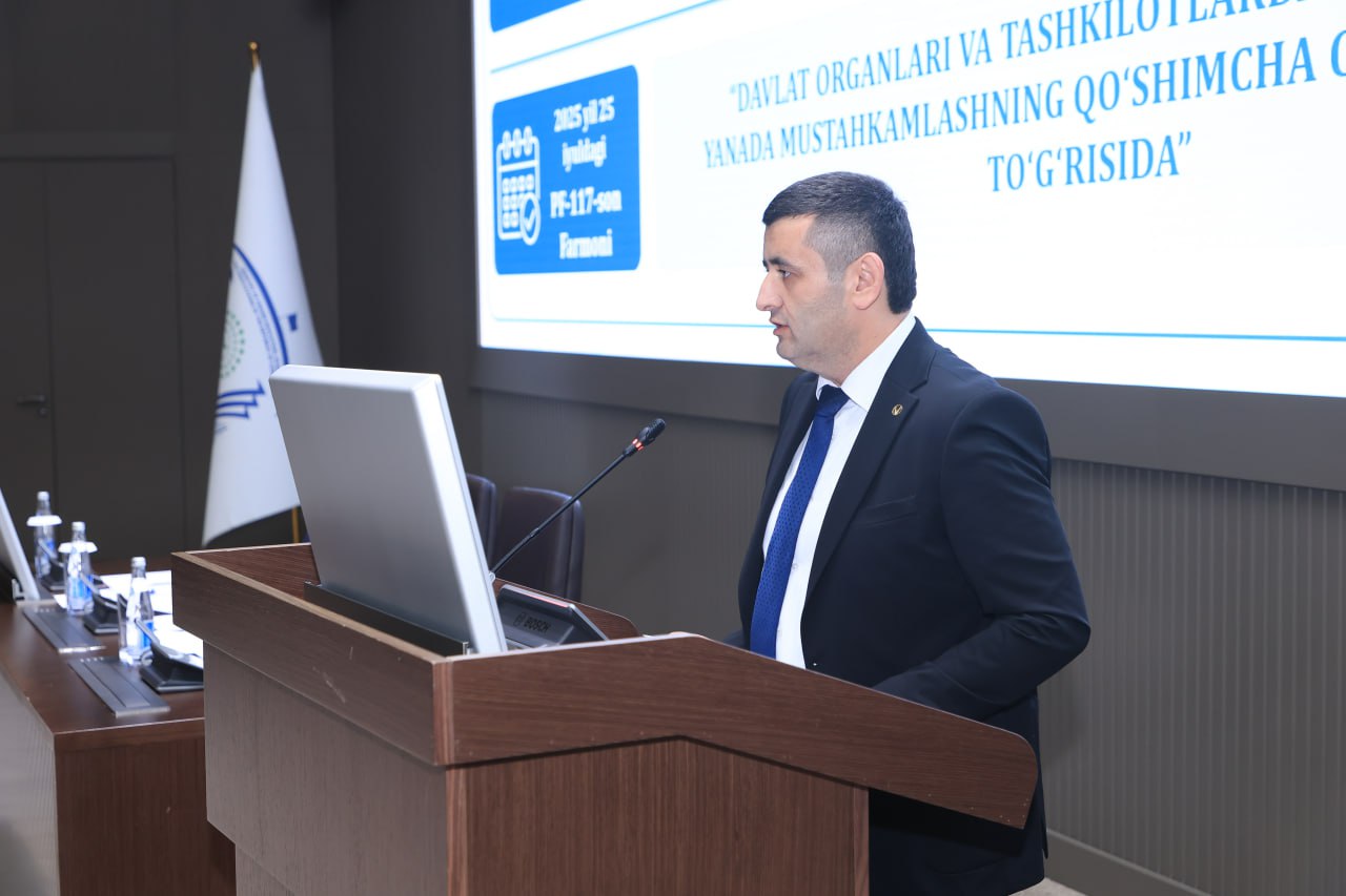 U o‘z nutqida ijro intizomini mustahkamlashning dolzarbligi, oliy ta’lim tizimidagi mas’uliyatli yondashuv zarurati hamda farmonning amaliy ahamiyatiga alohida urgʻu berdi. Seminar davomida ishtirokchilarga Prezident farmonining huquqiy asosi, davlat boshqaruvidagi ahamiyati hamda ijro intizomini mustahkamlash bo‘yicha qonunchilikdagi yangiliklar atroflicha tushuntirildi.
