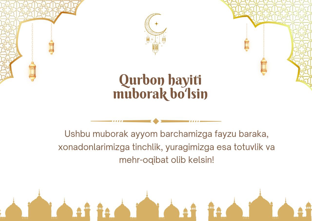 Mana shunday nurli va qutlug‘ kunlarda yurtdoshlarimizni, yuragida imon va mehr bilan yashayotgan har bir insonni Qurbon hayiti munosabati bilan chin dildan, samimiy muborakbod etamiz!