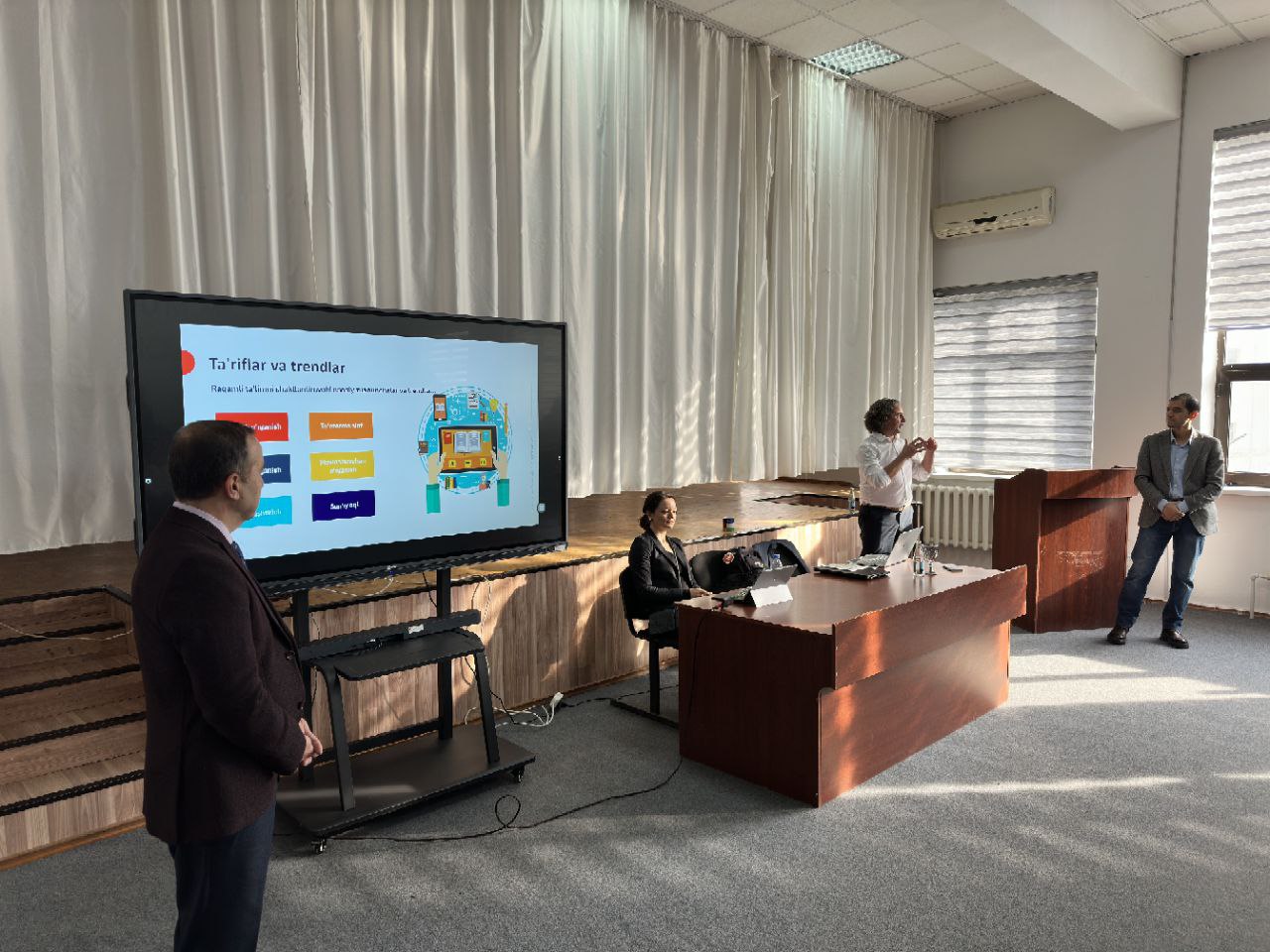 Seminar-trening halqaro ekspertlar Hörfurter Andreas va Bahram Atabeyli tomonidan olib borilib, unda raqamli va aralash ta’lim, onlayn vositalar, raqamli ta’limning pedagogik nazariyalari va konsepsiyalar, raqamlashtirishning moliyaviy jihatlari, raqamlashtirishda hamkorlik va tarmoqlarni yaratish, raqamli o‘qitishda multimedia materiallar, raqamli transformatsiyada boshqaruvni o‘zgartirish, mobil o‘qitish va «teskari sinf» tizimi kabi mavzular qamrab olingan.