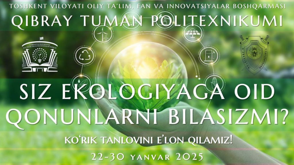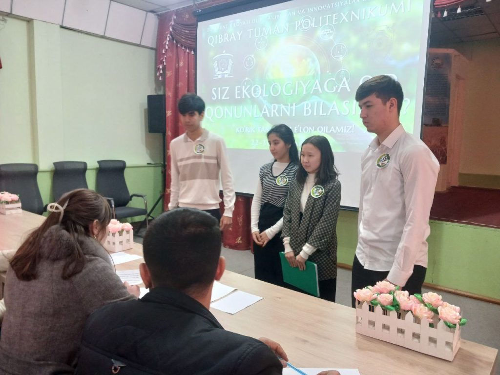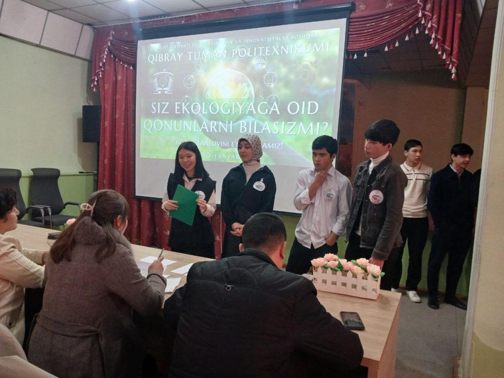2025-yil 27-yanvar kuni Qibray tuman texnikumida “Siz ekologiyaga oid qonunlarni bilasizmi?” respublika ko‘rik-tanlovining ta’lim muassasasi bosqichi bo’lib o’tdi. Tanlovda o’quvchi -yoshlar ekologiya va atrof- muhitni asrashga doir qonunlarning mazmun-mohiyati, tabiat ne’matlarini saqlash zarurati borasida sahna ko’rinishlari va taqdimotlar namoyish etildi.