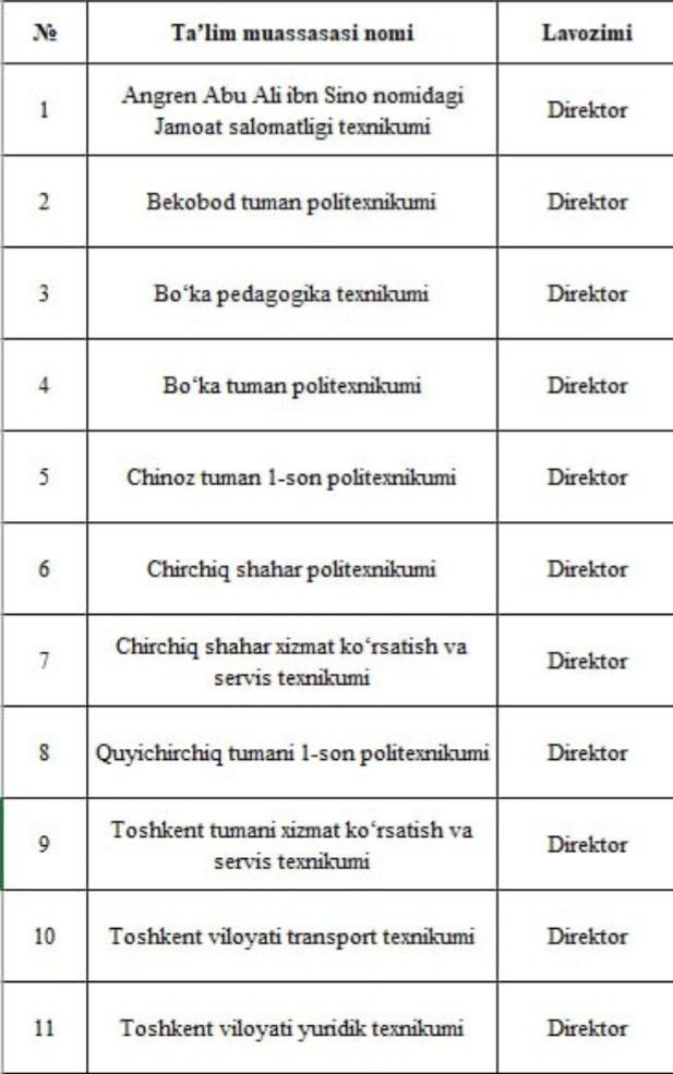 Oliy ta’lim, fan va innovatsiyalar vazirligi Toshkent viloyatidagi 11 ta kasbiy ta’lim tashkilotlari vakant direktor lavozimi uchun ochiq mustaqil tanlov e’lon qiladi.