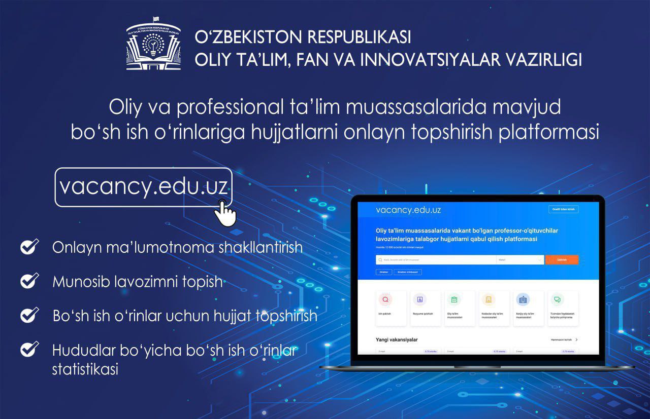 Talabgorlar tomonidan arizalarni yuborish vacancy.edu.uz (https://vacancy.edu.uz/vacancies/630) sayti orqali amalga oshiriladi.
