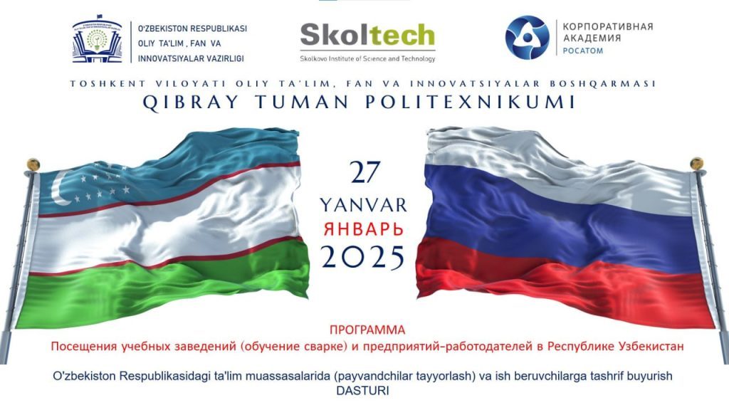 2025-yilning 27-yanvar kuni Qibray tuman texnikumiga Rossiyaning Skolkovo fan va texnologiya instituti hamda Rosatom Korporativ Akademiyasi rahbariyatidan iborat delegatsiya «O’zbekiston Respublikasi ta’lim muassasalarida (payvandchilar tayyorlash) va ish beruvchilarga tashrif buyurish» dasturi asosida tashrif buyurdi.